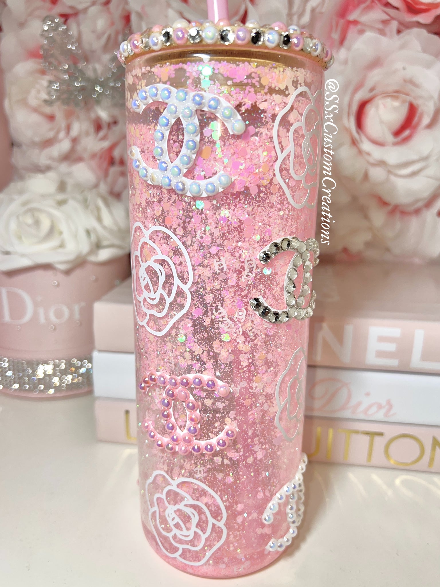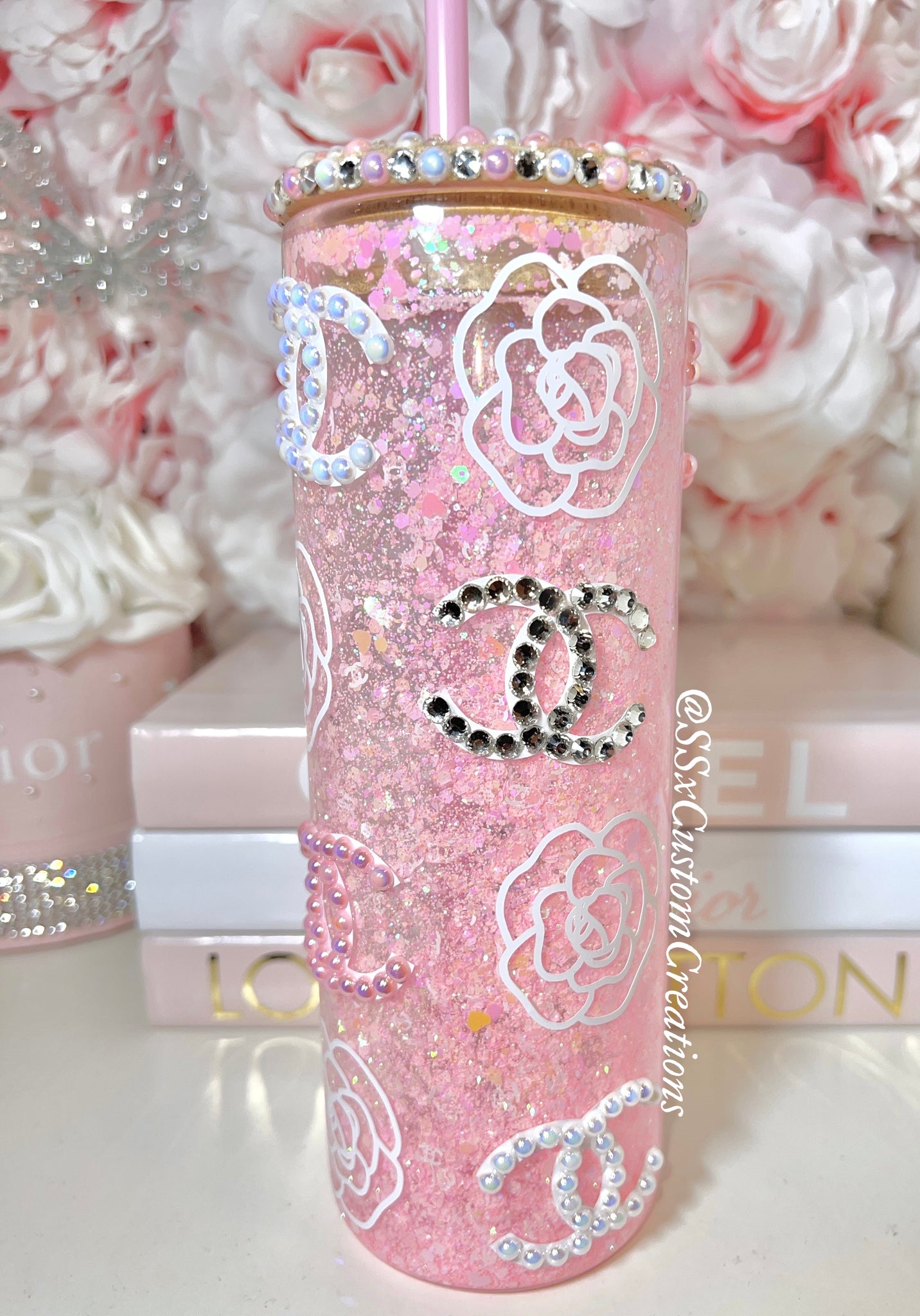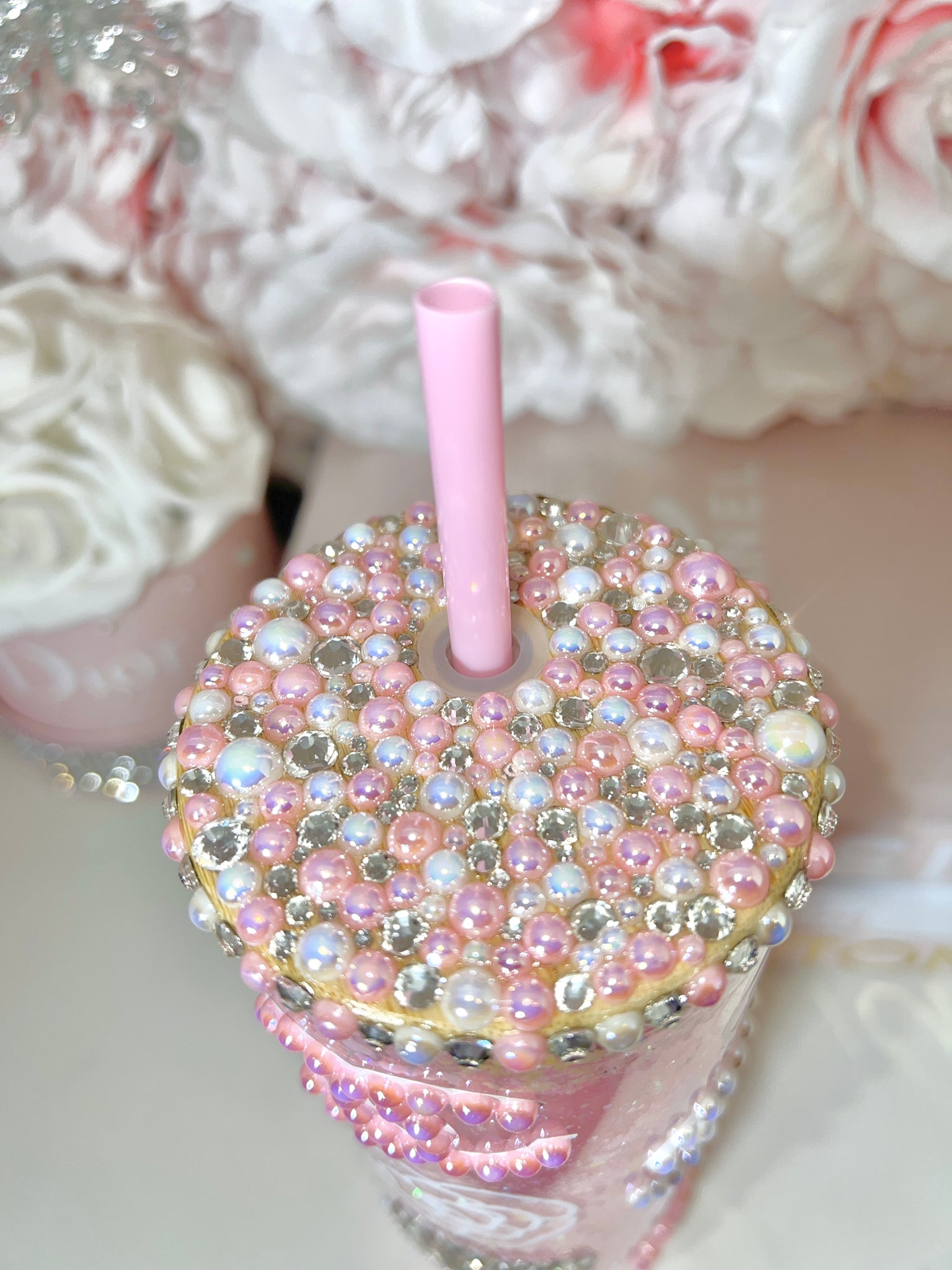 Embellished with pearls and glass luxe rhinestones on lid and on symbols . Floating CC glitter inside with pink glitter .
